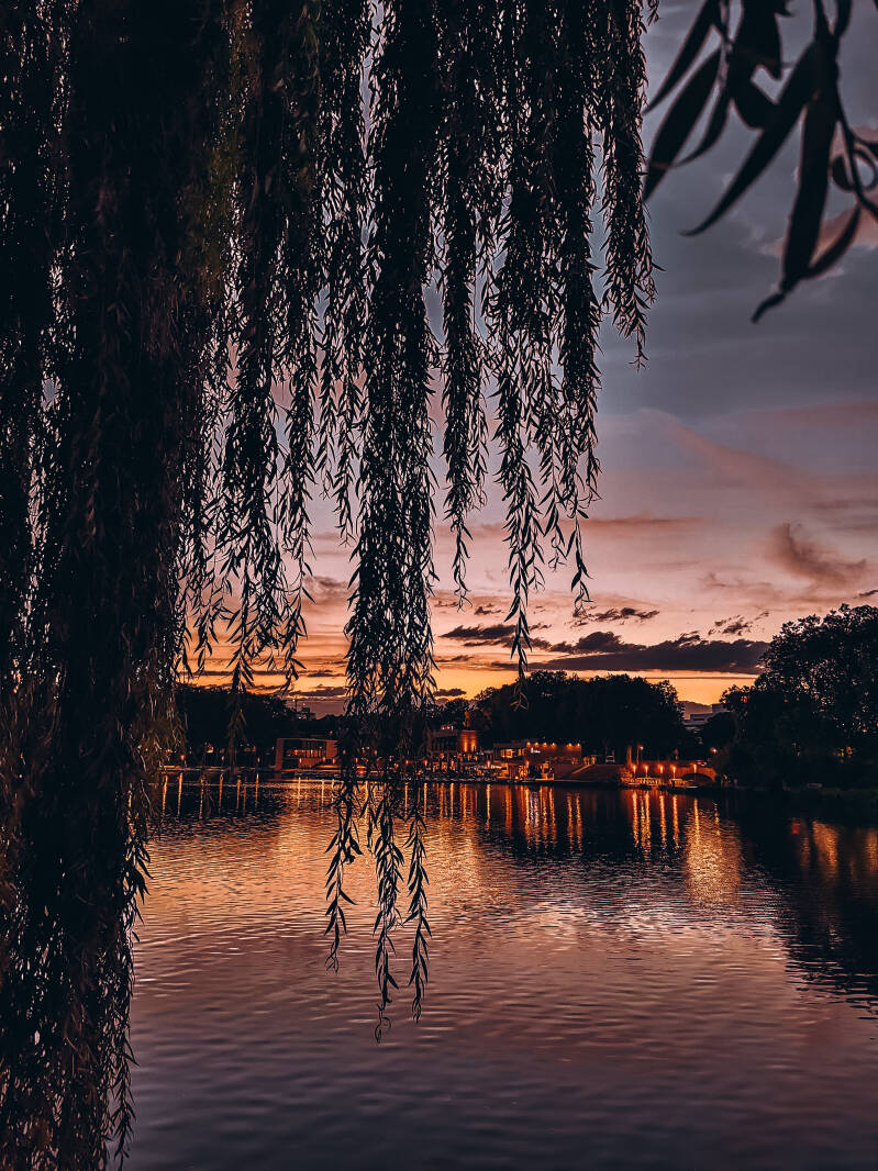 Вечерний Мюнстер порадовал нас летней атмосферой. Город - динамичный и спокойный одновременно, много кафе, где можно вкусно поесть, много архитектуры радующей глаз, ну и конечно парк с озером.