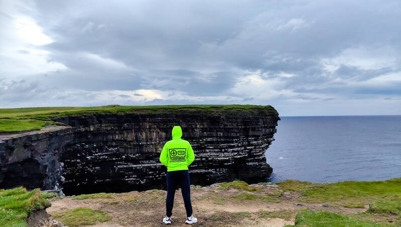 Вечерний закат дарил тёплые лучи уходящего солнца. Ветер утихал когда мы запускали дрон. После жарких лучей и подъёма в гору, наступал мелкий дождик. К слову о погоде в Ирландии (в Мае) могу сказать только одно. Она переменчива. Предугадать и подготовится не возможно. За то время, что мы находились в Ирландии мы ходили как в футболках так и в тёплых куртках или в дождевиках. Ветер, который срывает с ног проходил и наступал штиль и гармония, солнце сменялось тучами, после 5ти минутного проливного дождя наступала радуга и это могло с нами случатся всё за один лишь день.