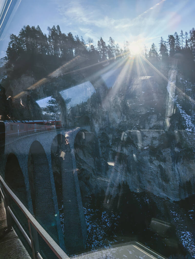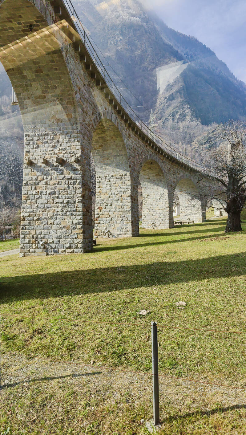 Путь по которому проходил весь маршрут, был незамысловатым, но со своими красивыми местами, альпийскими горами, маленькими деревушками и конечно же виадукт под названием Ландвассер – воплощение красоты и мощи. Шедевр, который своими глазами обязан увидеть каждый любитель железных дорог. Этот виадук на 65 метров возвышающийся над бурлящей рекой – один из самых изящных железнодорожных мостов в Граубюндене. Бернина Экспресс – это один из самых известных и популярных маршрутов по швейцарским Альпам. Это кстати, одна из самых высоких железных дорог в Европе и один из самых крутых железнодорожных путей с наклоном до 7%.