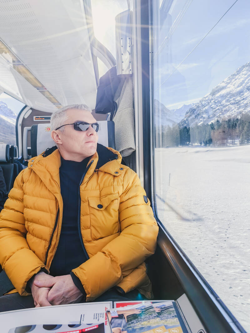 Путь со Швейцарии до Италии лежал через альпы. У нас с собой была еда, термос с чаем и время. Время для нас двоих. Места в поезде я забронировала с панорамными окнами и не прогадала. В зимнее время пейзаж гораздо красивее, нежели весной или осенью. Один лишь отрезок на высоте более 2000 м. где располагалось замершее озеро стоило проделанных усилий.
